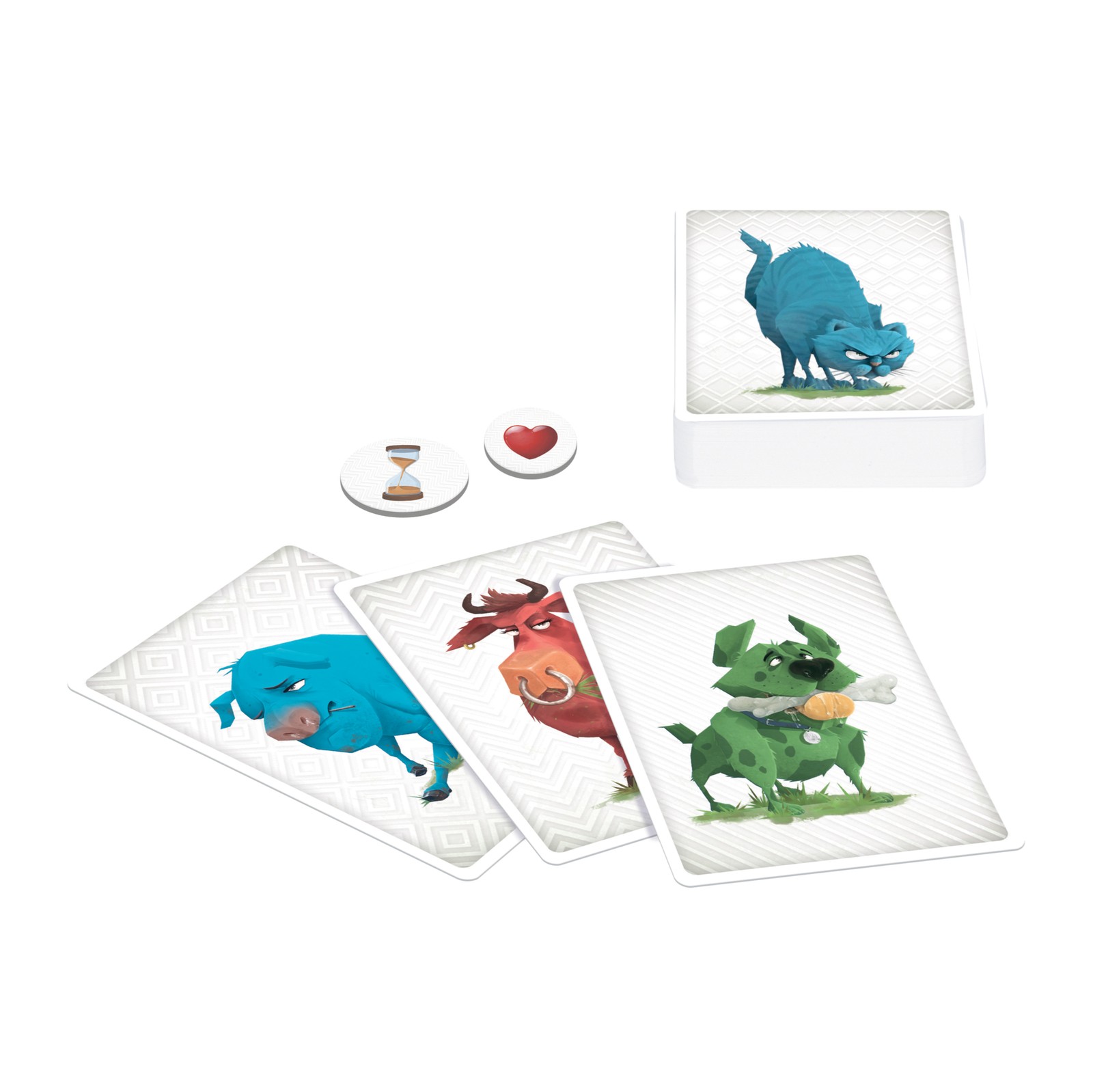 The basic rule of the Blue Cow is simple – when it is your turn, you turn over the top card of the deck and immediately say what is on the card and what color it is (e.g. a blue cow or a green dog). However, the Rules will gradually enter the game, changing what you have to say or do when the card is turned over. One mistake means you lose one life, and whoever is first to lose all their lives, loses the game.