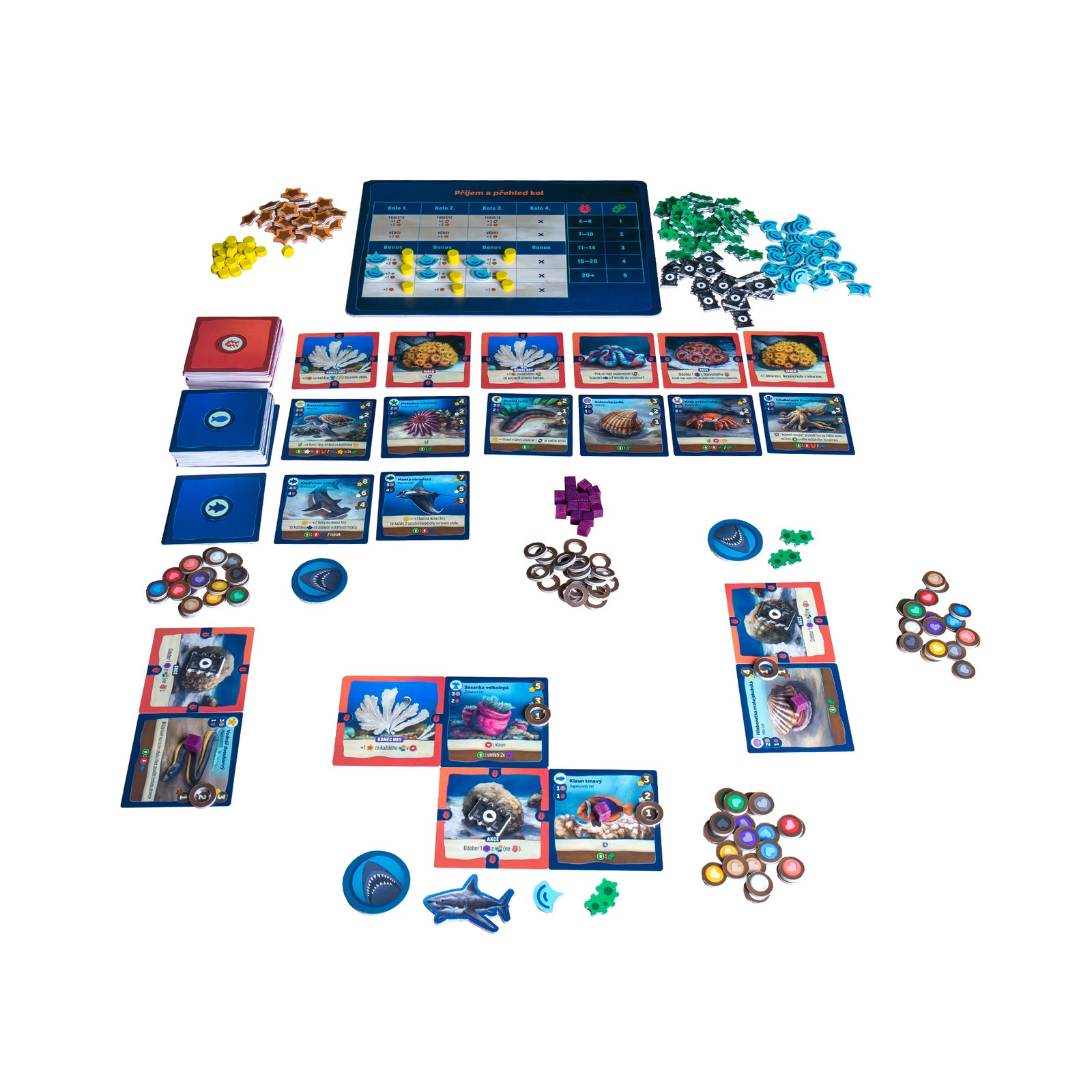 52 coral cards including 4 starter corals, 62 animal cards, 20 event cards, 60 plankton tokens, 60 money tokens, 50 scale tokens, 20 pollution tokens, 20 popularity tokens, 50 population indicators, 70 fatigue cubes, 8 hunt tokens, 80 symbiosis tokens, 1 turn overview board, 1 starting player token, 4 reference cards, 1 rulebook