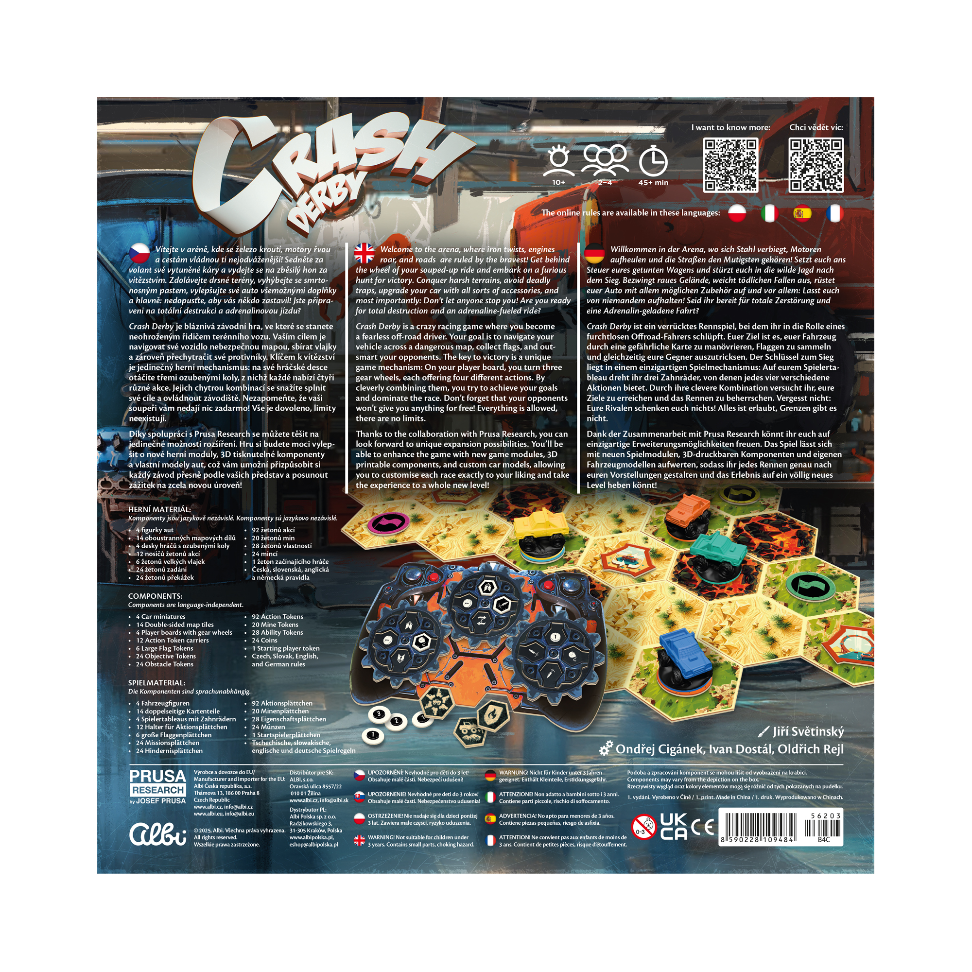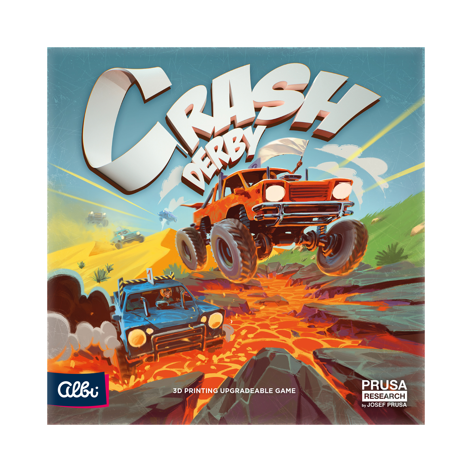 Crash derby is a strategic and dynamic racing game in which players try to navigate their pre-determined route while trying various explosions by bumping and other means to ensure that other players complete their route as late as possible. The game is being developed in collaboration with Průša Research and includes 3D printed cars. It is planned that new downloadable files will be created to allow players to make their game more interesting.