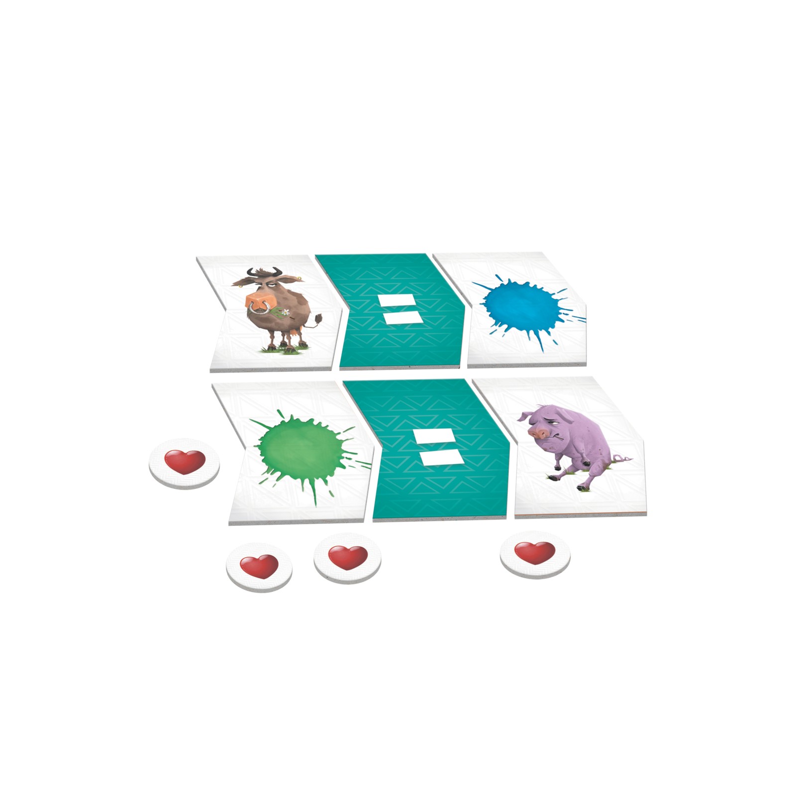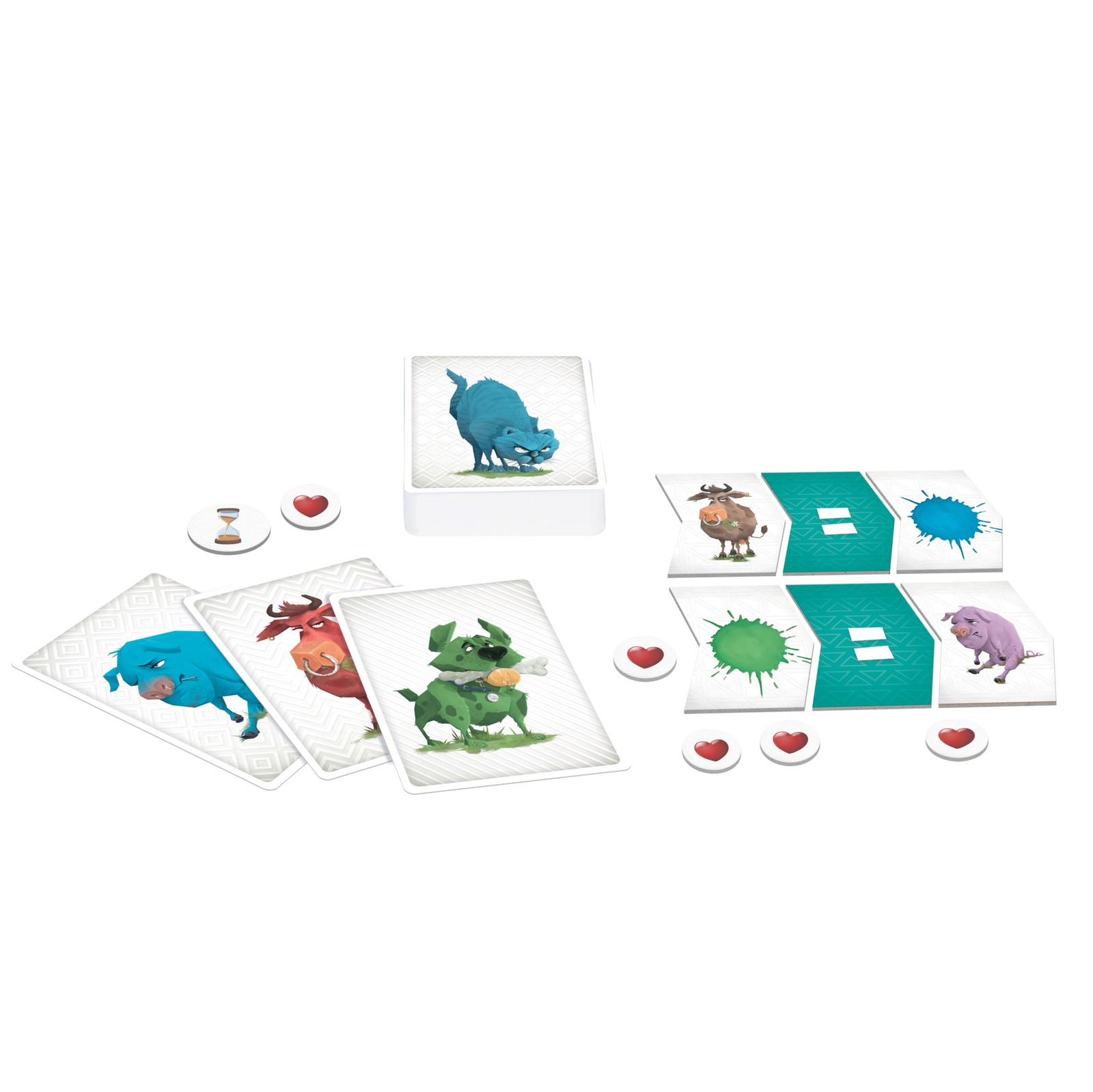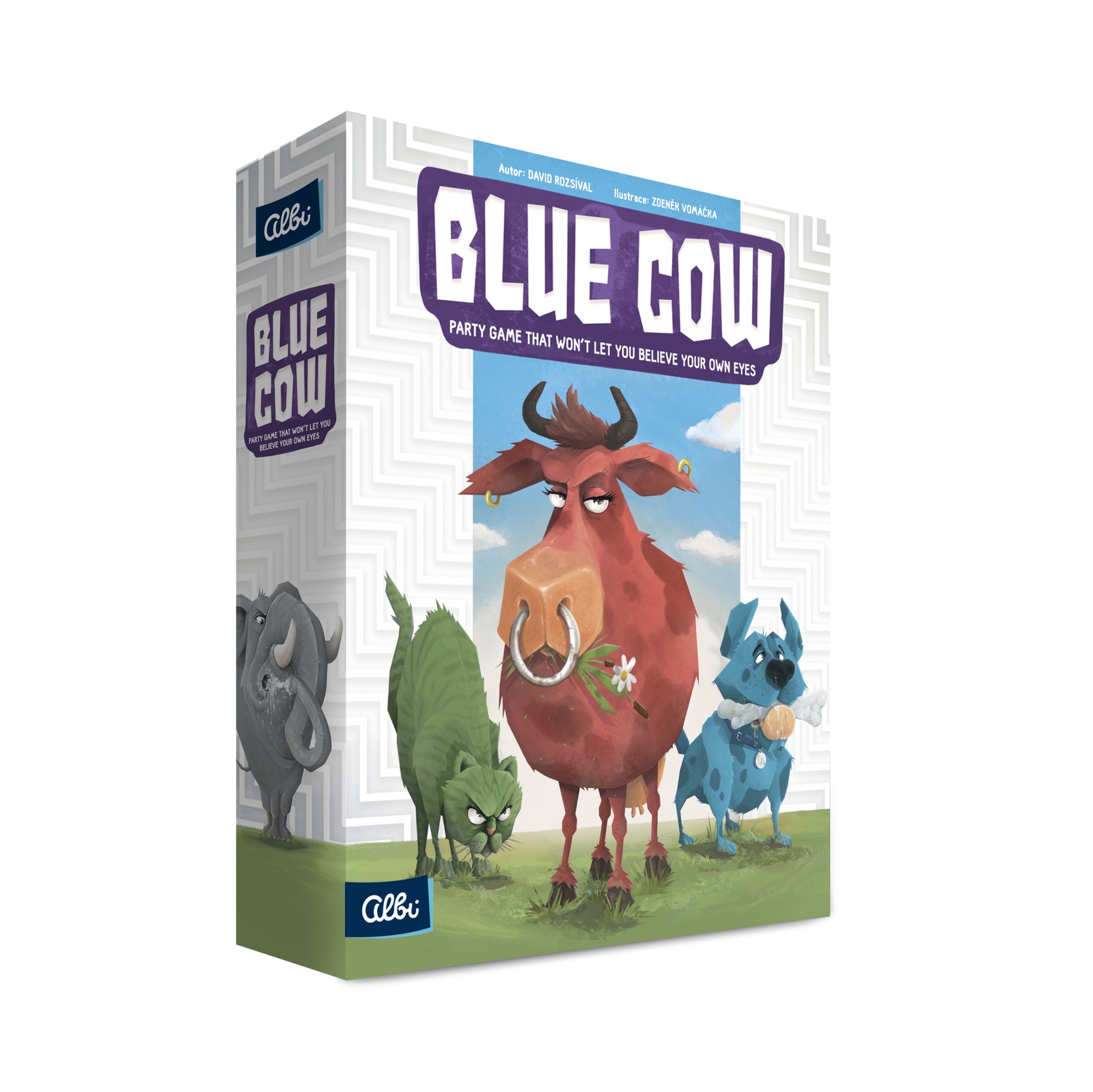 The basic rule of the Blue Cow is simple – when it is your turn, you turn over the top card of the deck and immediately say what is on the card and what color it is (e.g. a blue cow or a green dog). However, the Rules will gradually enter the game, changing what you have to say or do when the card is turned over. One mistake means you lose one life, and whoever is first to lose all their lives, loses the game.