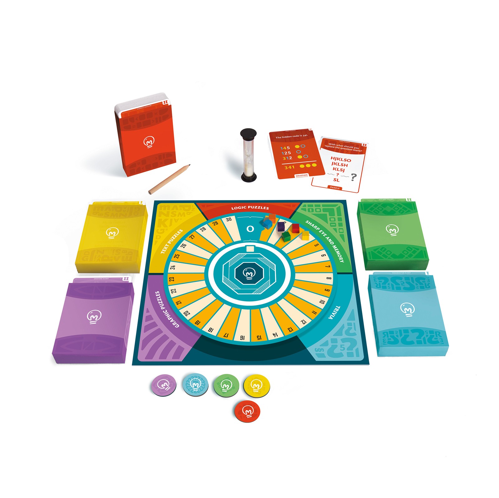 6 player pawns, 30-sec sand timer, 6 betting dials, 275 cards with puzzles, 5 boxes for the cards, 5