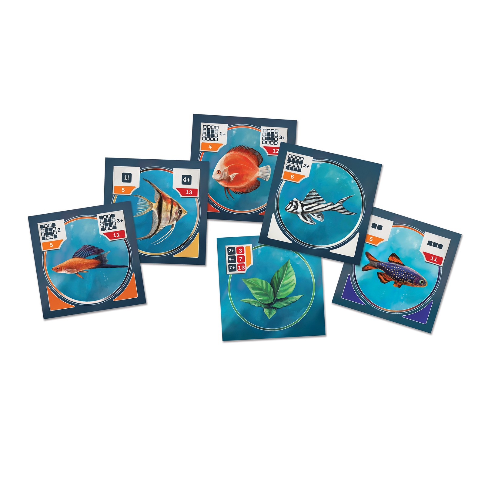 Fish Tank is a tableau-building game in which each of the players collects fish for their aquarium. Each kind of fish has different criteria for scoring; some prefer the edges of the tank, some like to be in the middle, some like to gather together and some don’t like to have their kind around them. The players draft their fishes in 2 phases of the game, each consisting of 8 rounds. At the end of the game, each player has a 4 x 4 tableau of multicoloured fish in front of them. The player whose fish tank generates the most points is then declared the winner.