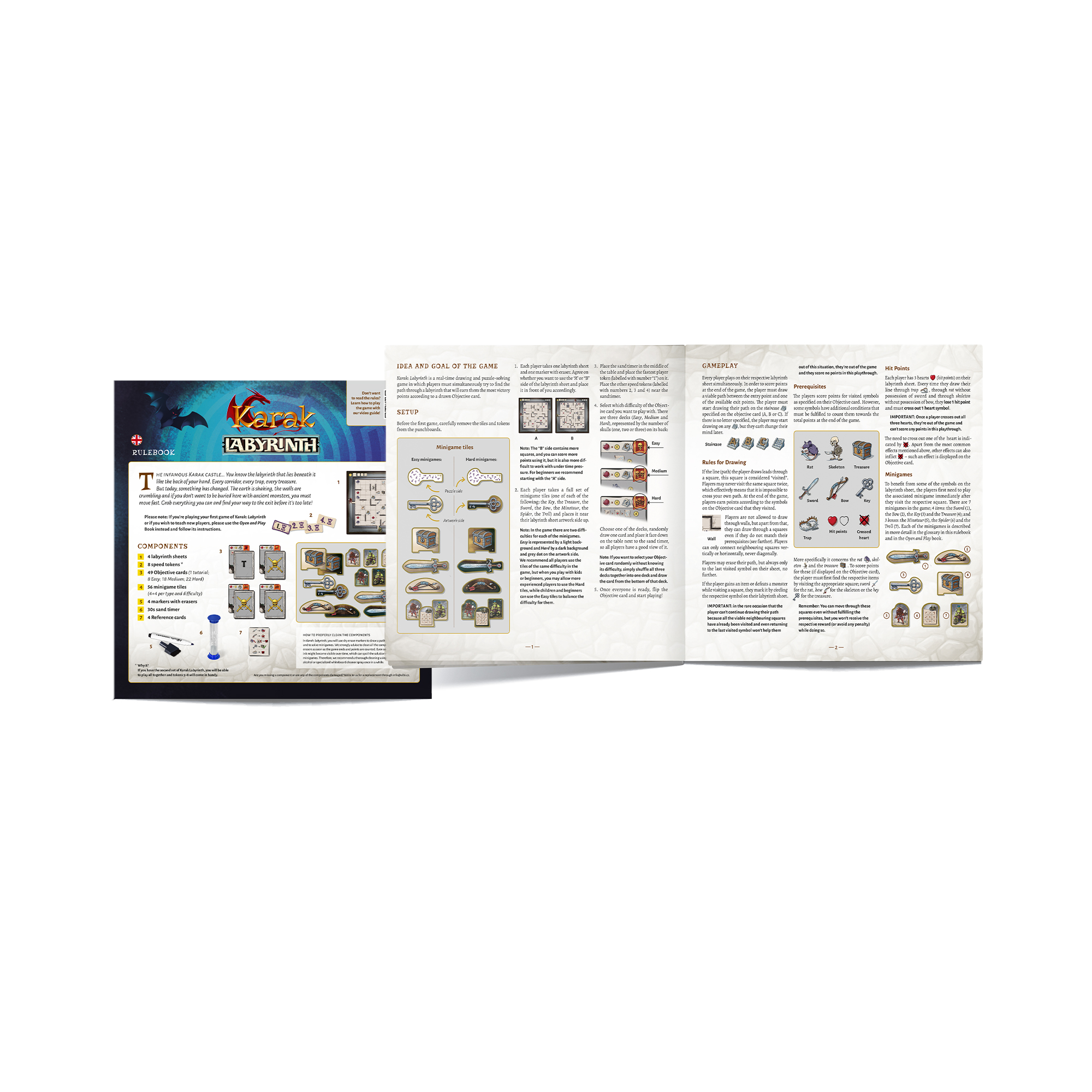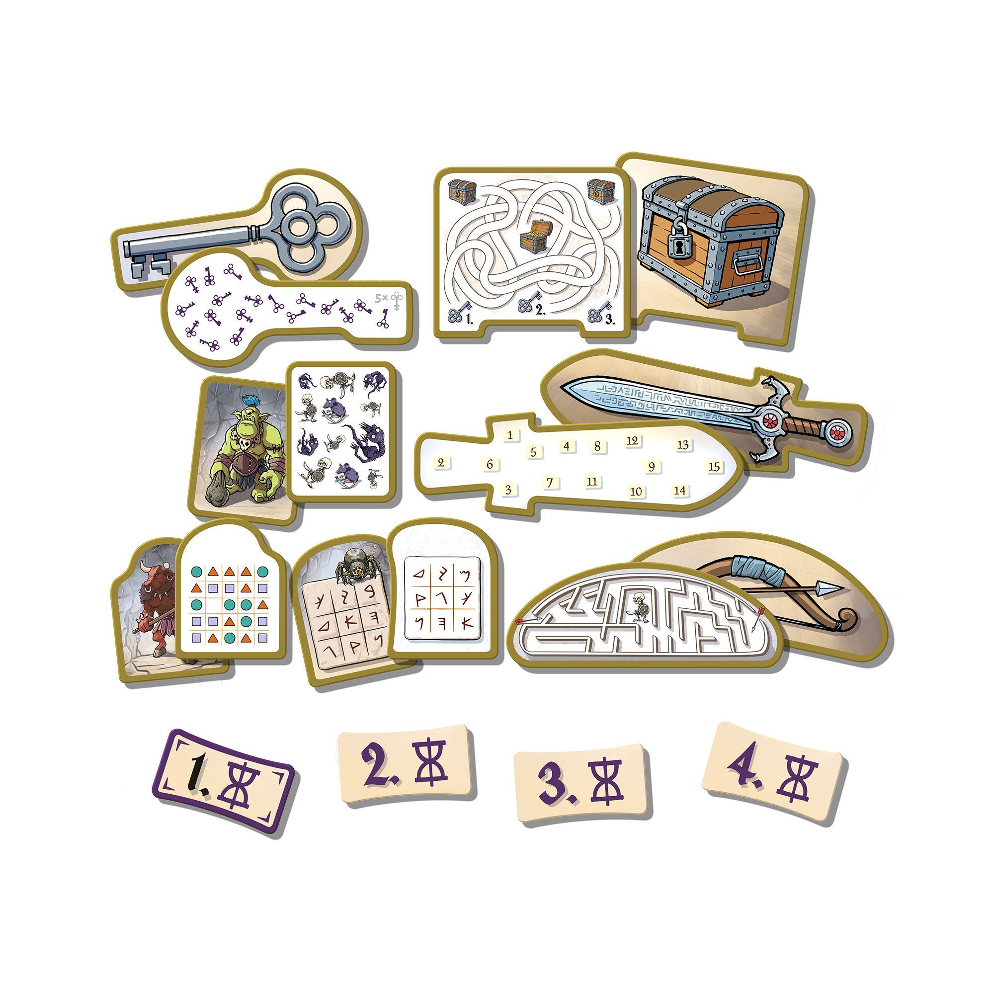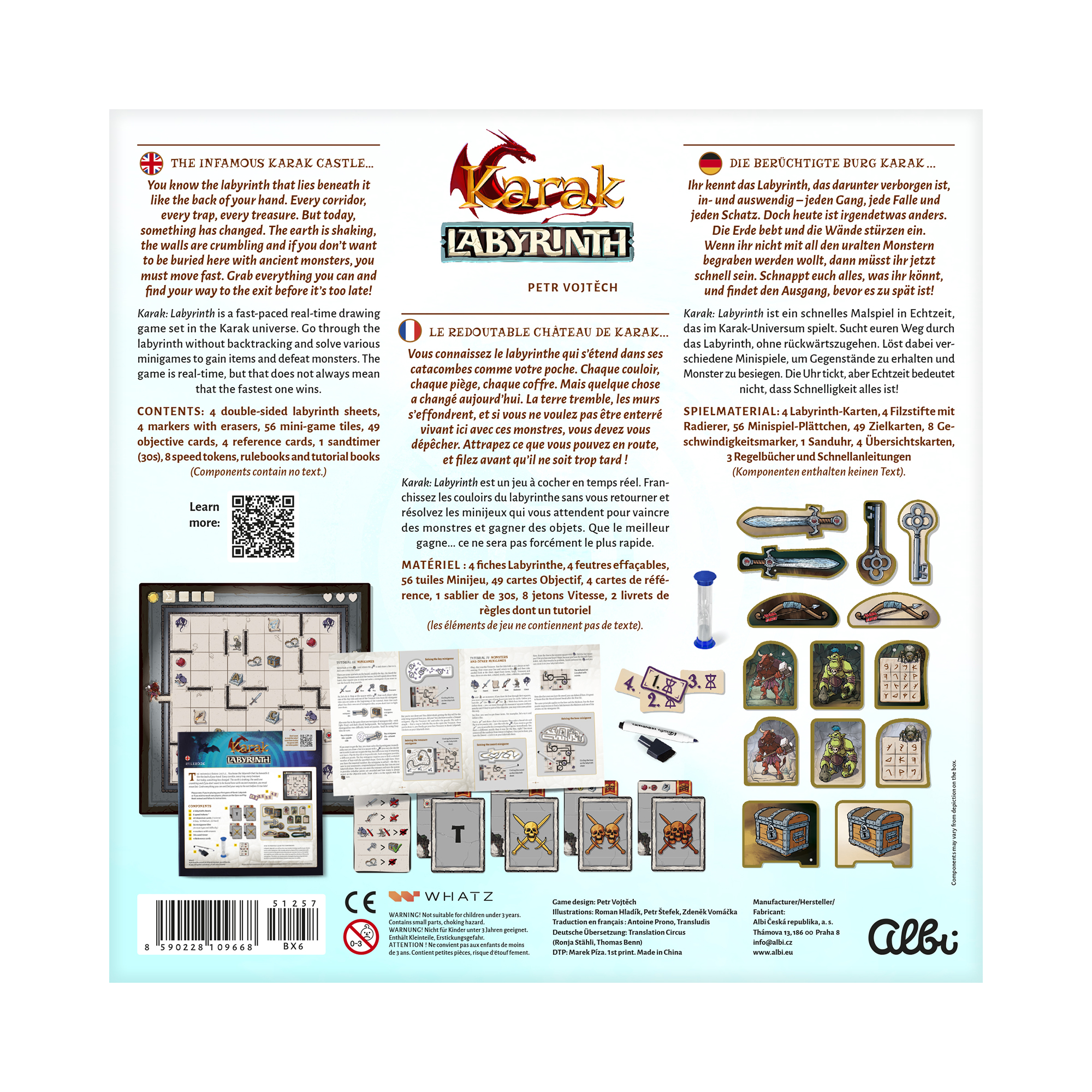 Karak: Labyrinth contents: 4 double-sided labyrinth sheets, 4 markers with erasers, 56 mini-game tiles, 49 objective cards, 1 sandtimer (30s), 8 speed tokens, 4 reference cards, rules in English, German and French.