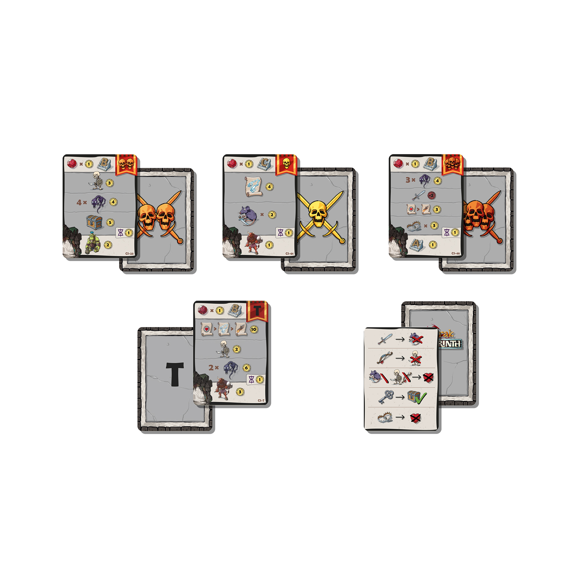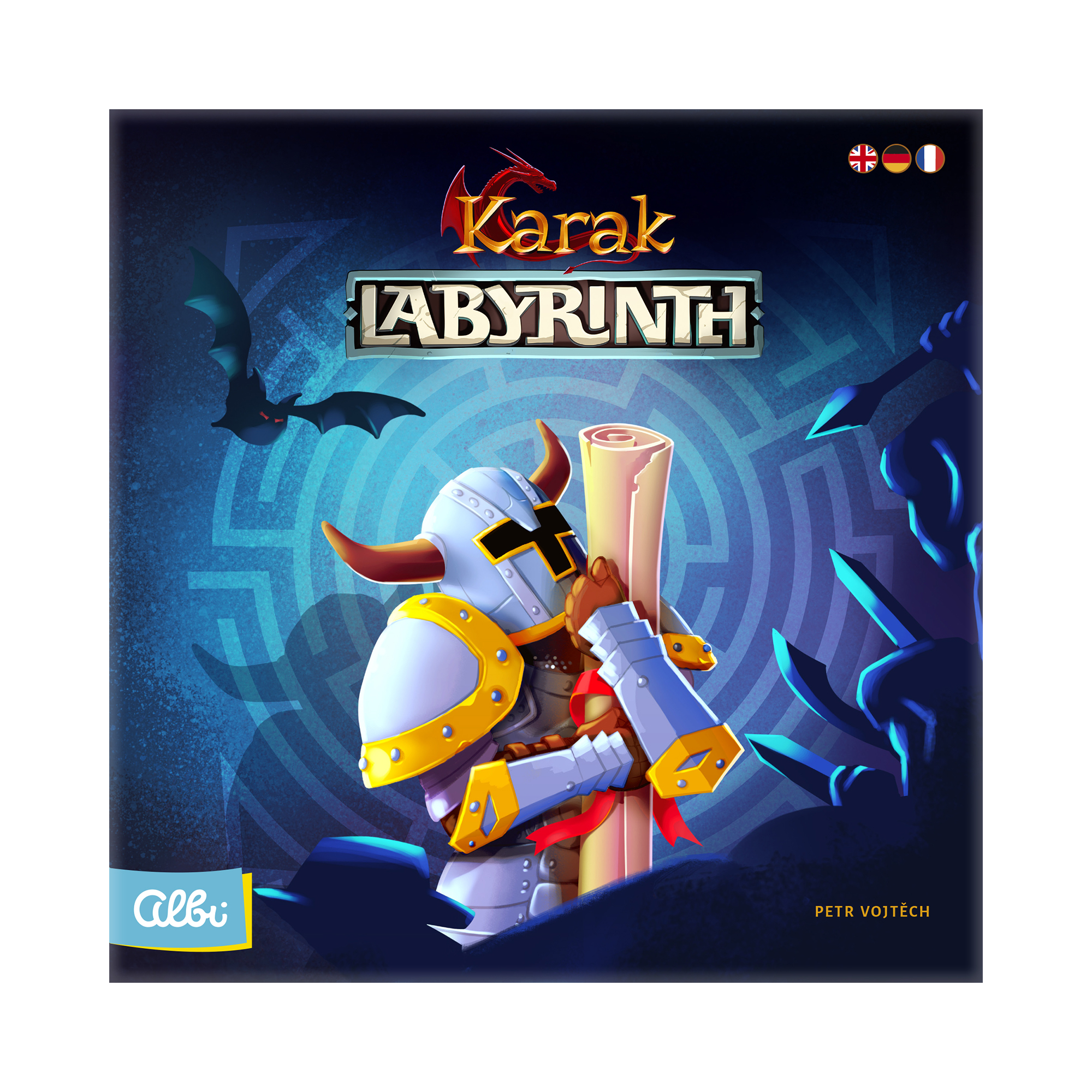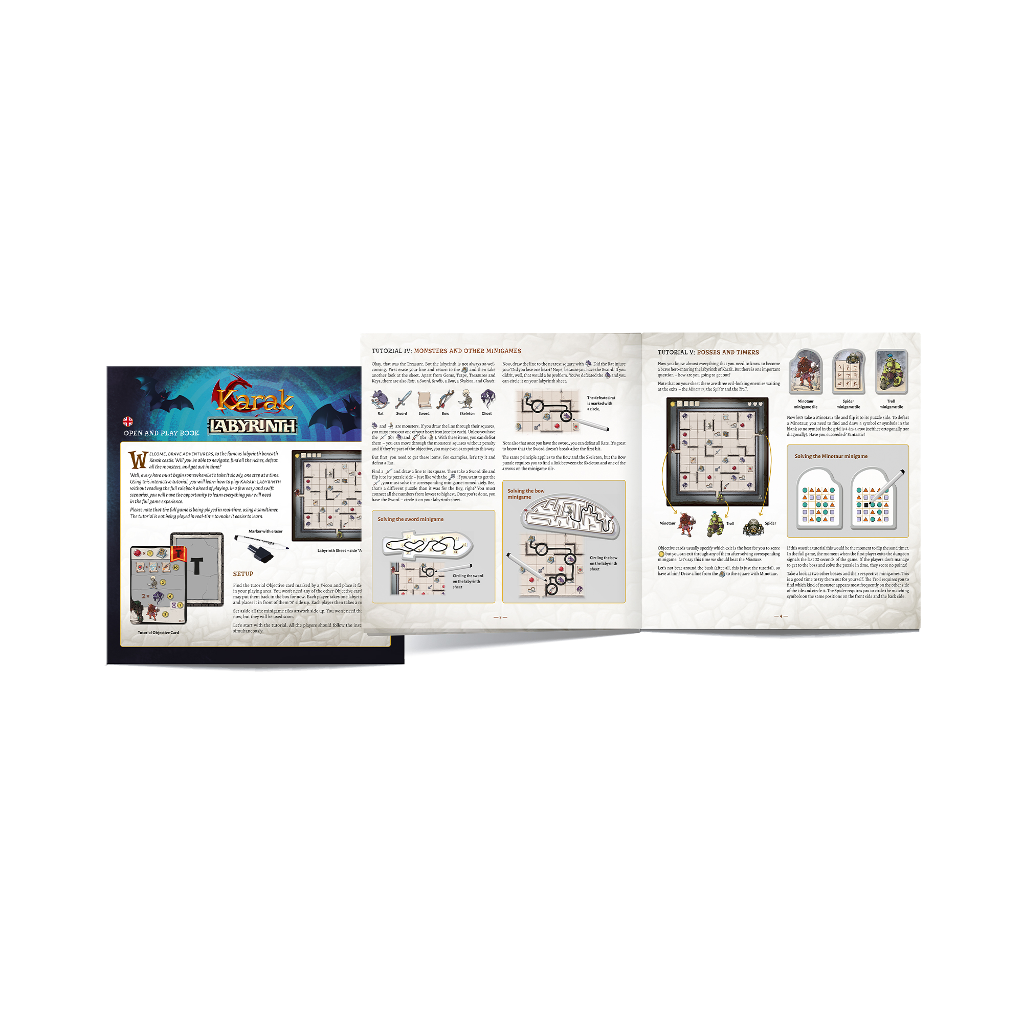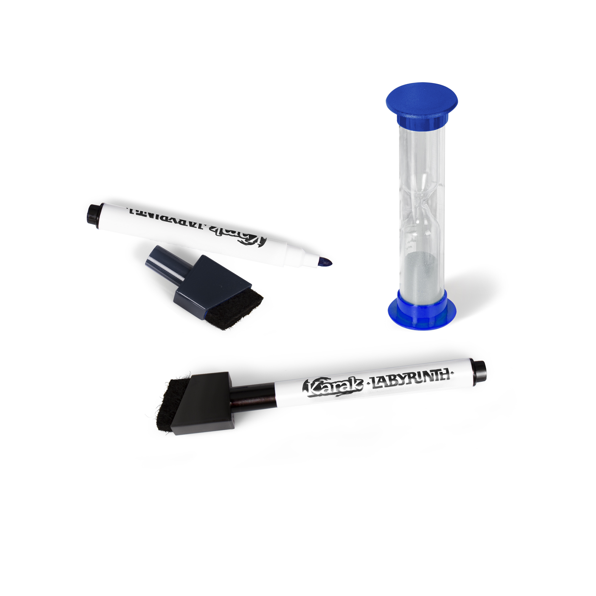Karak: Labyrinth contents: 4 double-sided labyrinth sheets, 4 markers with erasers, 56 mini-game tiles, 49 objective cards, 1 sandtimer (30s), 8 speed tokens, 4 reference cards, rules in English, German and French.
