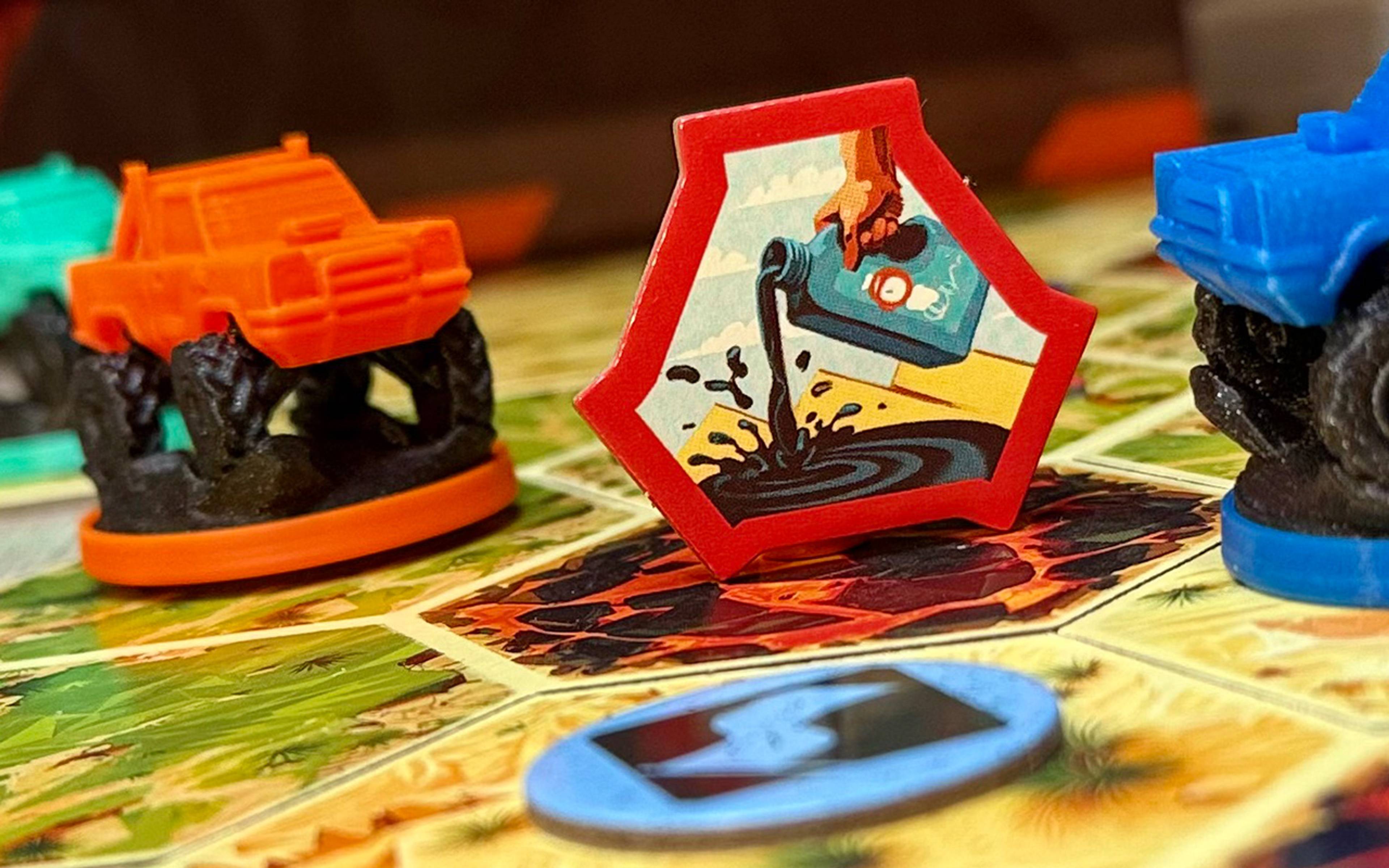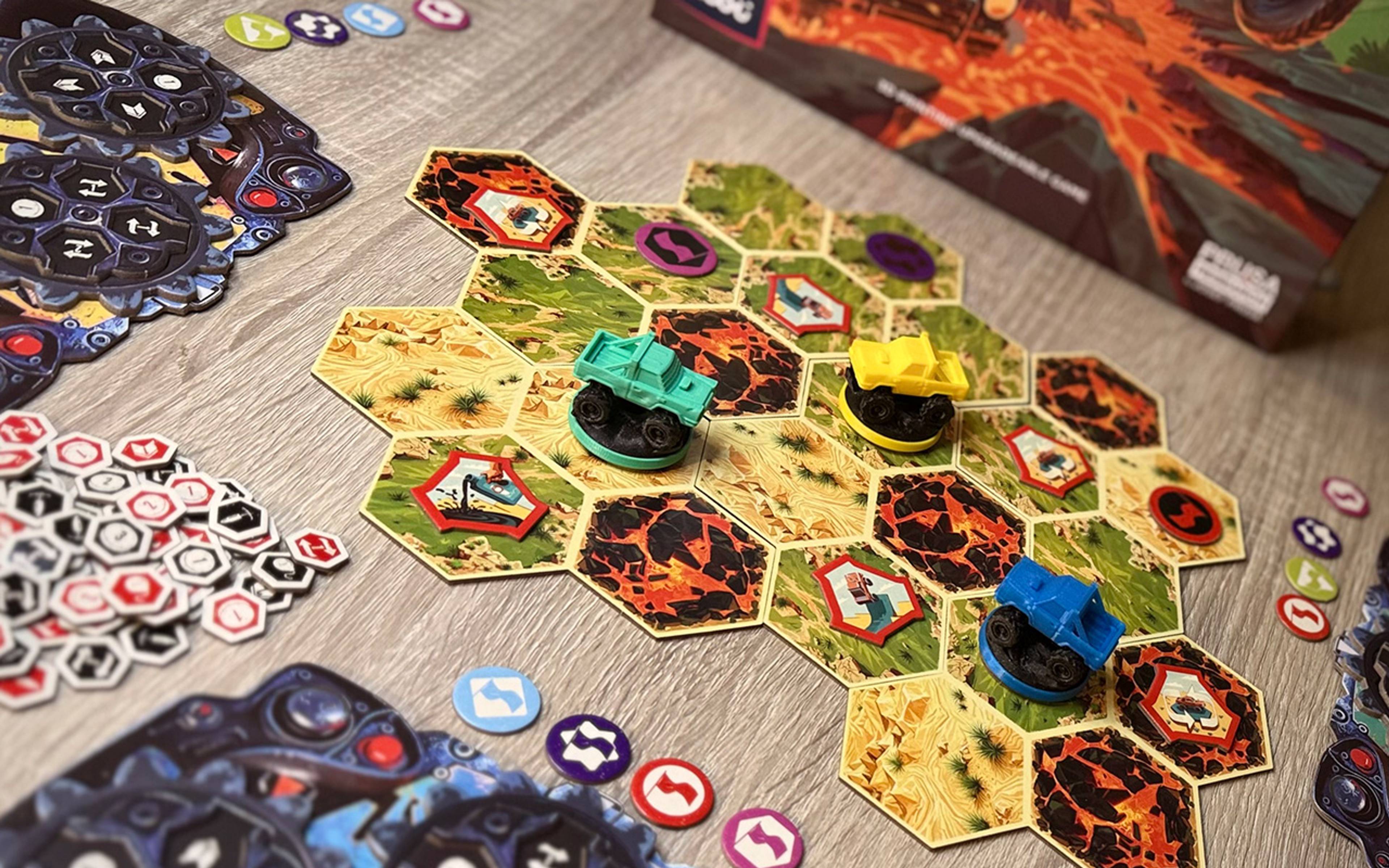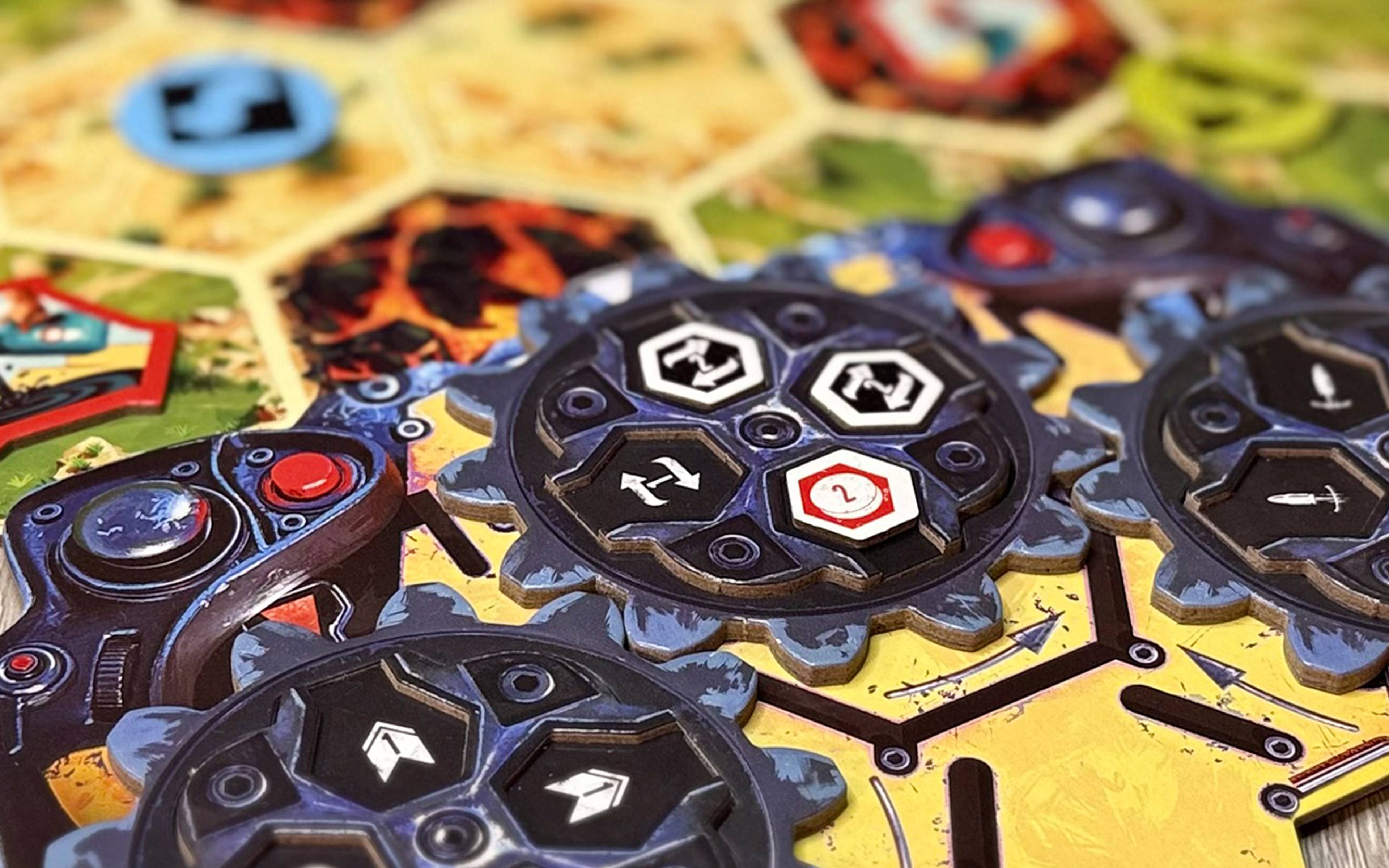 Each player has a board with three interlocking gears that represent their car’s steering system. Every gear offers four possible actions: turning, shooting, preparing a mine, gaining a coin, or moving. You’ll need to plan several steps ahead while accounting for constant interference from other players. On your turn, you rotate the gears—if you mismanage your actions, your car can quickly turn into an uncontrollable machine. The gear mechanism adds both flair and meaningful strategic depth. Every decision matters, and a single mistake can change the outcome of the race.