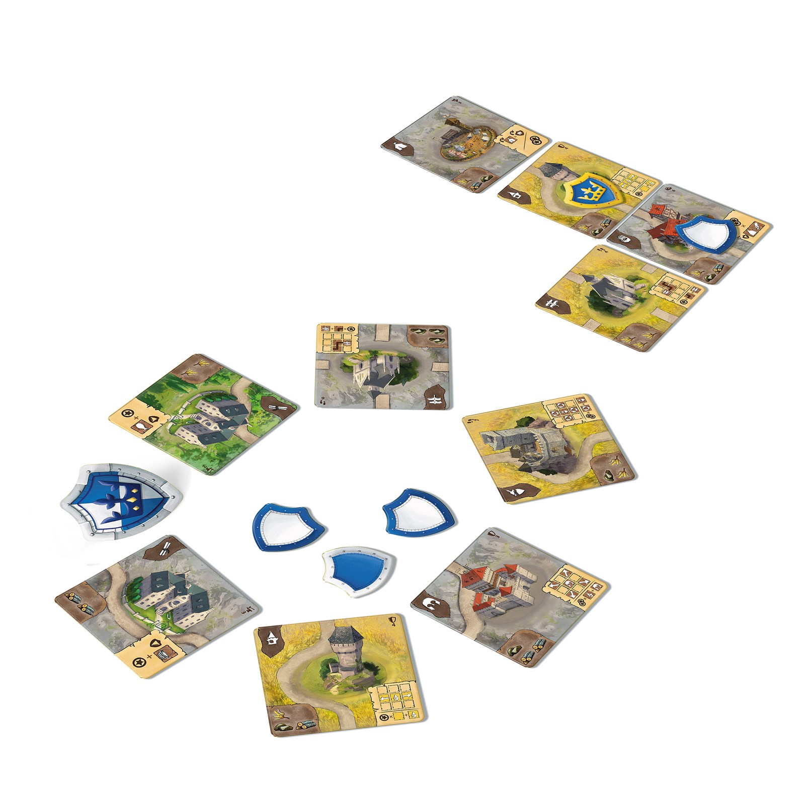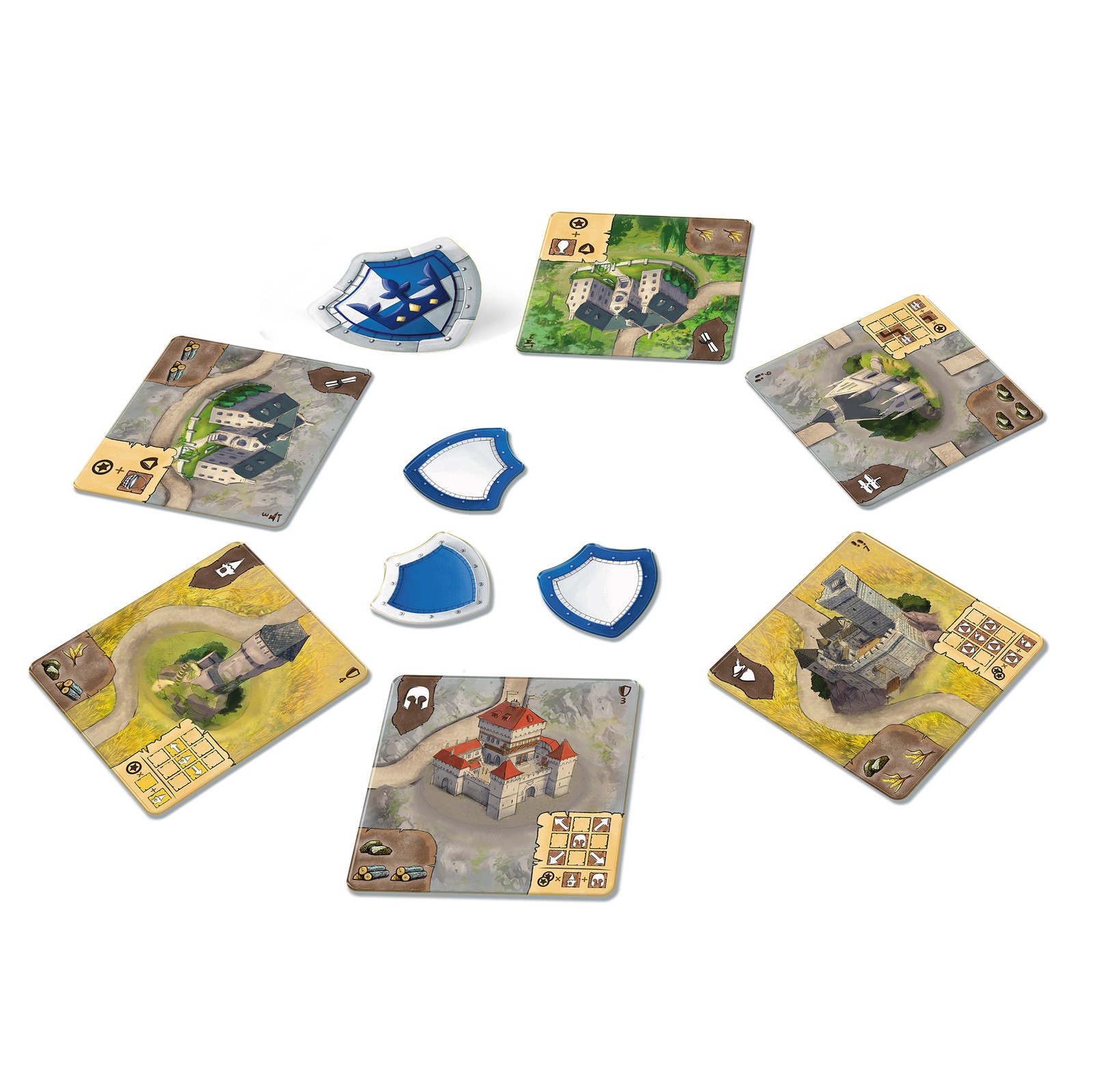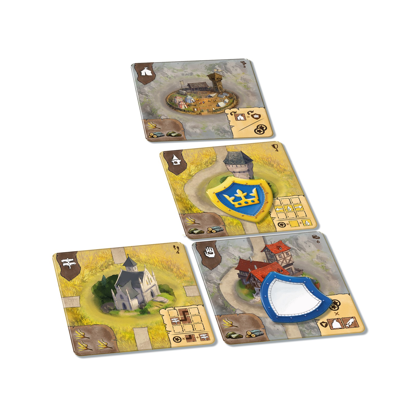 54 building tiles: 6 sets of 9 tiles, 6 small troop tokens (shields): 4 regular troops and 2 retinue troops with a yellow outline, 1 large royal shield token, 11 solo mode tokens, 1 solo game rulebook, and 1 rulebook.