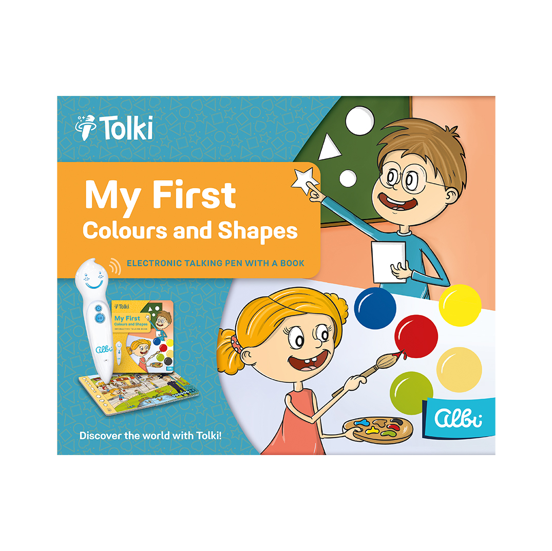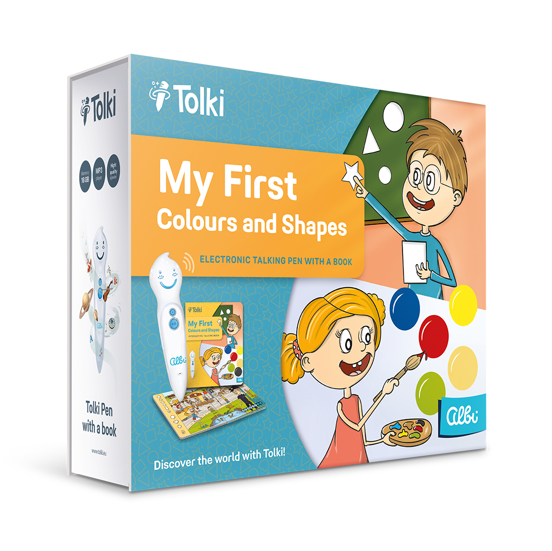 Tolki the electronic talking pen, My First Colours and Shapes book, 32 GB SD card, charger, USB cable, Guide to the Tolki World, headphone jack (headphones are not included).